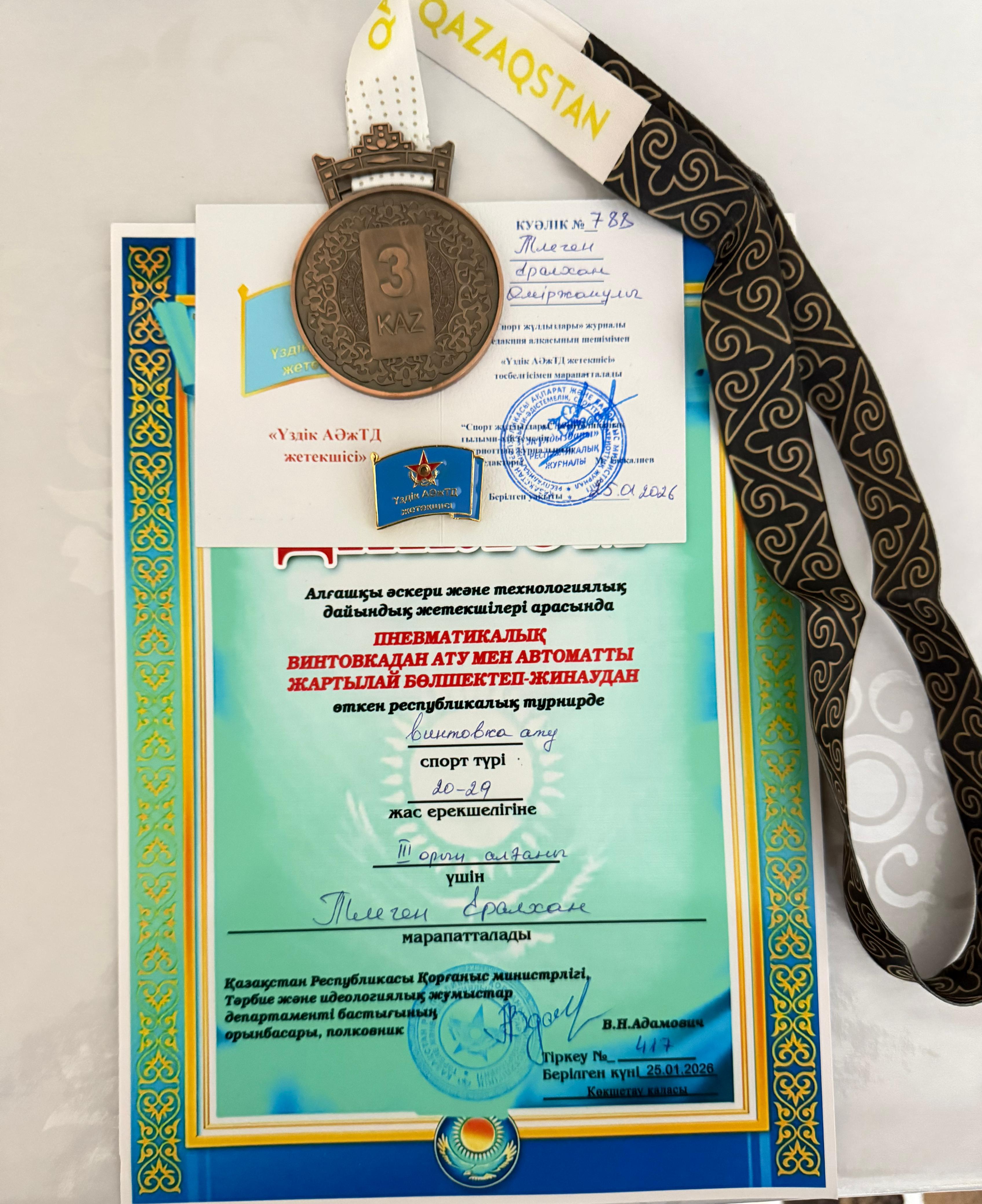 2026 жылдың 25 қаңтар күні Көкшетау қаласында өткен алғашқы әскери және технологиялық дайындық пәні мұғалімдері арасында ұйымдастырылған «Пневматикалық винтовкадан ату және автоматты жартылай бөлшектеп жинау» бойынша республикалық турнирге біздің оқу орнының жас маман ұстазы Е.Ө. Тлеген қатысып, жүлделі ІІІ орынға ие болды.