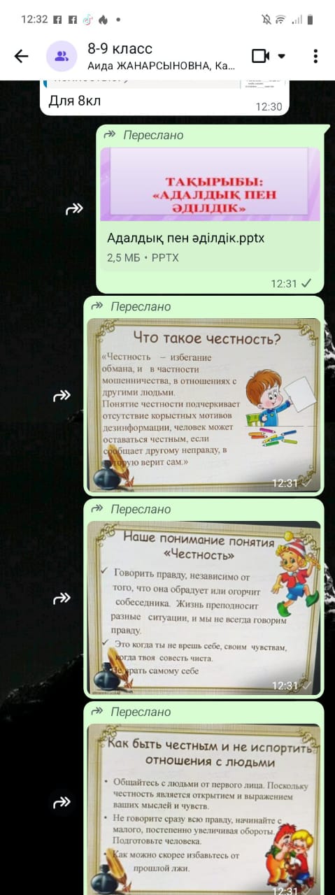 В рамках месячника «Закон и порядок» 15 января, в день «Честность и справедливость», школьный добровольный клуб «Адал ұрпақ» представил презентацию для учащихся на тему «Честность и справедливость». Мероприятие было направлено на формирование нравственных ценностей и правовой культуры.